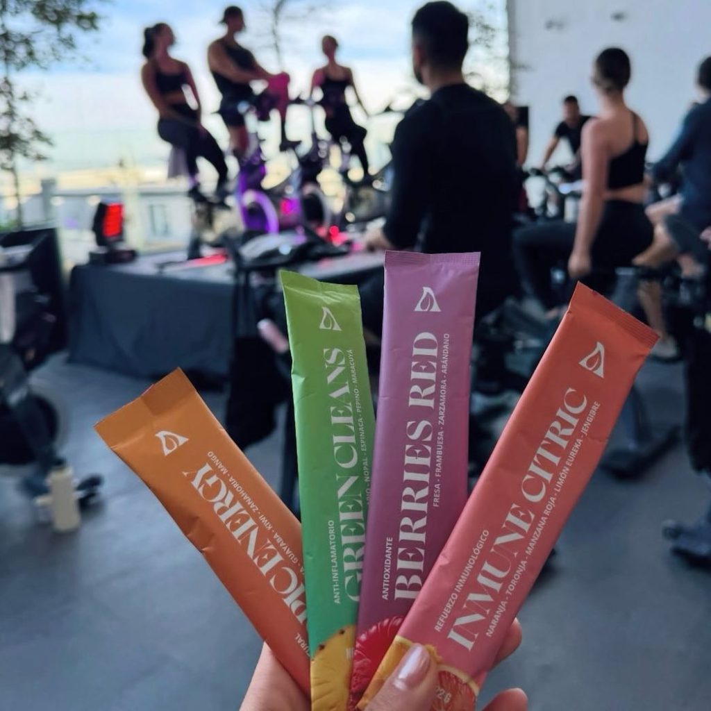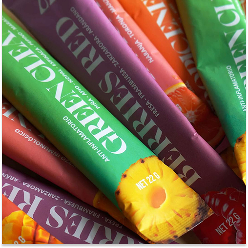 Cuatro sabores. El verde, crudo y profundo, se desliza en la garganta como la tierra misma. Los berries estallan, dulces y oscuros, como un secreto guardado en la piel. El tropical arrastra el sol, cálido y húmedo, dibujando un rincón de verano en cada sorbo. El cítrico corta, fresco y afilado, como el aire cuando se respira a plena luz.